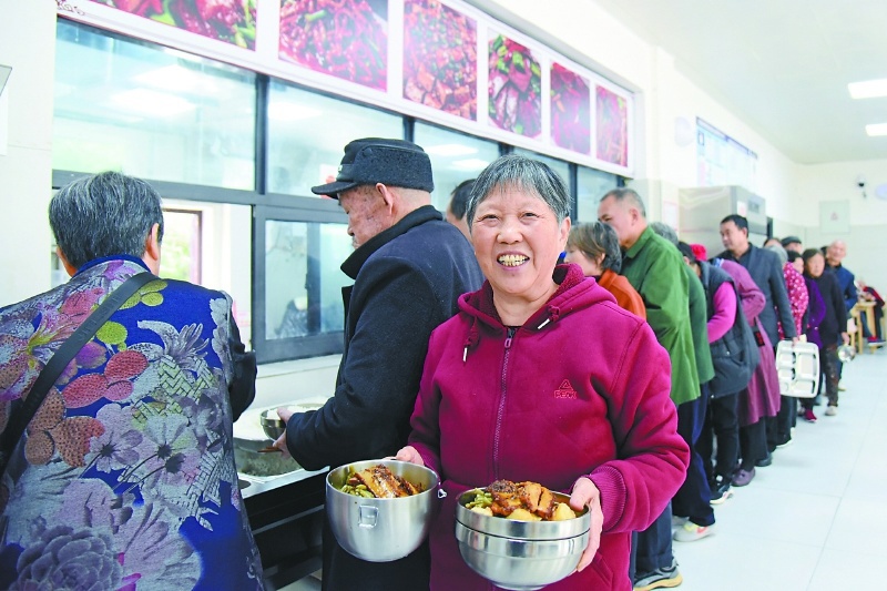 老人们在新政镇紫东怡家幸福食堂排队打饭。
