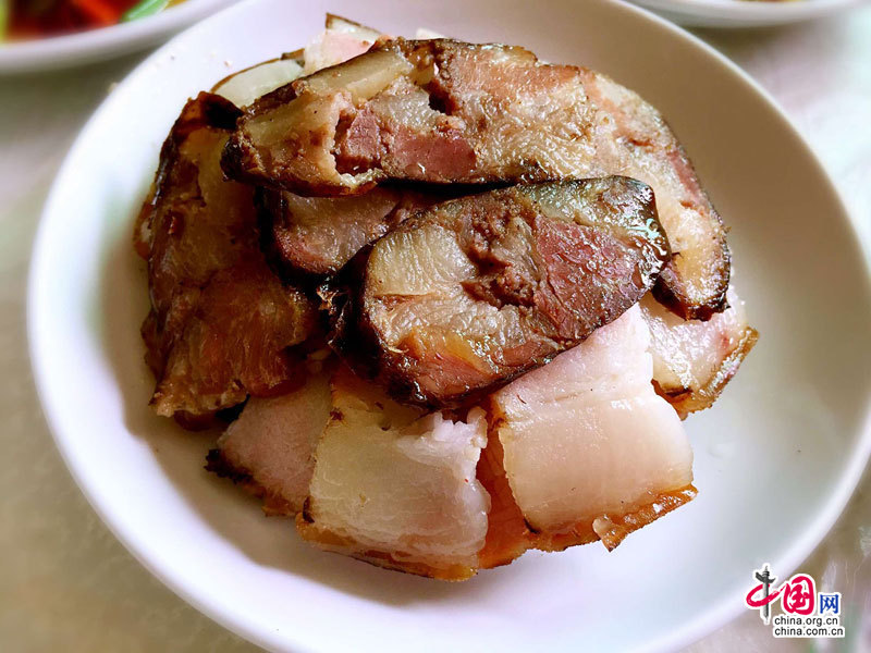 还有,在战争年代,为了存储或是行军携带的方便,一些食物需更长时间的保存,如当地腊肉、血豆腐、屯堡香肠等,烟熏风干后的成品放置于干燥通风处,一个对年也不会坏,如果家里是烧柴火的,那挂在灶台上方的肉,随吃随取,蒸或炒食,都会是香薰味儿十足。也是本人非常喜爱的菜品。