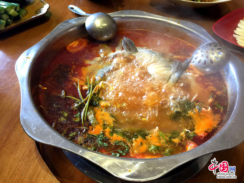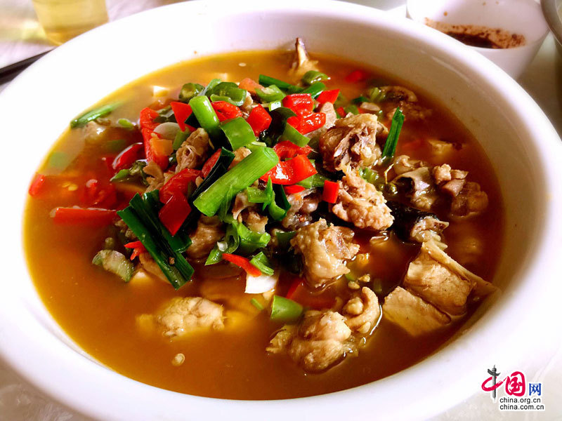 当然,辣仅是贵州菜安顺菜的一个口味,酸,也是其非常有特点的吃法,代表菜品酸汤鱼,这种酸是发酵后的酸,并不像现在我们在北京或其他地方吃到的酸汤鱼那样浓稠,而是清爽,将鱼肉蛋白的鲜在酸的作用下完全释放融入汤中,吃肉喝汤,再配上一些时令蔬菜,荤素搭配,营养均衡,且色彩也很漂亮,红绿相间。