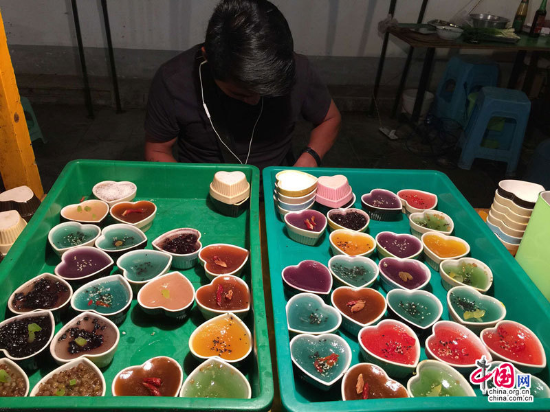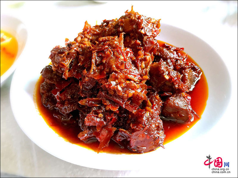 除了贵州的风味,安顺的美食还自成一派,这与屯堡人过往的战争历史不无关系,那天旧州的广场正举行当地的美食大赛,最有特色的算是军帐宴,只是可惜我们赶路而错过了。每一个地方的饮食习惯受历史影响,也更受地方的自然环境影响,比如霉豆腐,当天在旧州的午餐中,它只是以配角出场,用火烧好的茄子、青椒,撕成细条以后拌上半块霉豆腐,以豆腐的咸鲜和时间酿出的豆香增味,是一道简单又美味的下饭菜;还有鸡辣子,对!不是辣子鸡,而是类似豆瓣酱一样可以拌饭或面条,更可以直接食用的当地美味,鸡辣子取当地走地童子鸡(三个月左右的)以手工捣成的片状胡辣子,再配以独特配方炒制,整个鸡肉都浸满酱汁,香而不辣,据说,旧州人家家都会做鸡辣子,但是每户人家的鸡辣子都会有自己独特的口味与秘制配方绝不外传,现在已有袋装出售,是带回家和送亲友的好礼物。