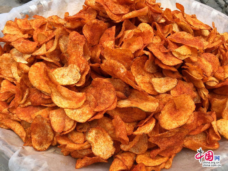 天龙屯堡参观时,看到寨子里的卖小吃的地方围了好多人,吃货果然是无处不在,原来卖的是当地人现炸的土豆片,金灿灿的洋芋片薄薄的,看起来就嘎嘣脆,再在上面撒上一层红红的辣椒花椒粉,闻起来香辣,顿时爆口水了,吃起来,太!辣!了!整个口腔被辣椒“点燃”似在燃烧,作为四川人,人家一直觉得我们应该是超级无敌不怕辣的,可是,我被打败了,后来晚上,去好吃街上,再次证明了我作为四川人在吃辣上是赛不过贵州人,人家是不怕辣的,一起宵夜的赤水姑娘黄小姐说她刚到安顺时,觉得安顺的辣椒没味道(不够辣),总会专门从遵义(据说遵义的辣椒是最最辣的)带辣椒。