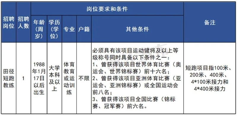 面向社会公开招聘1名田径短跑教练员。