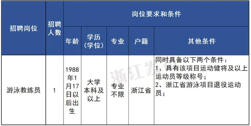 面向浙江省内优秀退役运动员公开招聘1名游泳教练员。