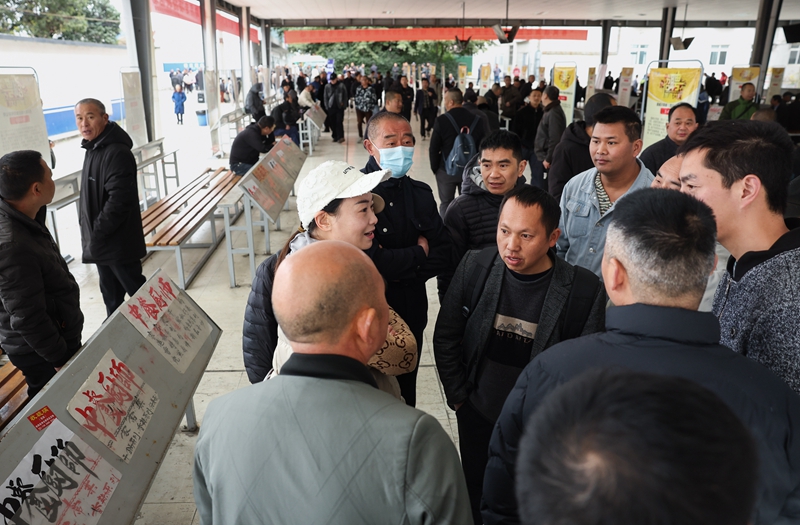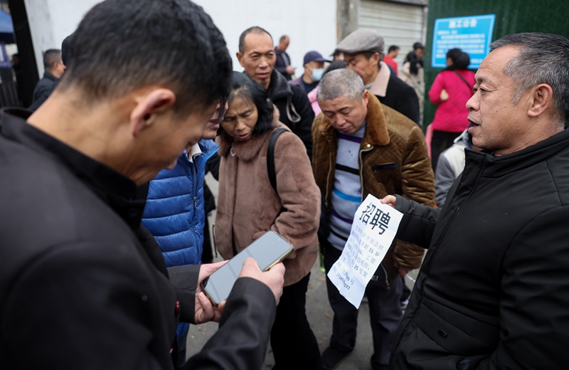 2月21日,在成都市锦江区人力资源市场,一位招聘者(右一)手拿招聘信息招人。