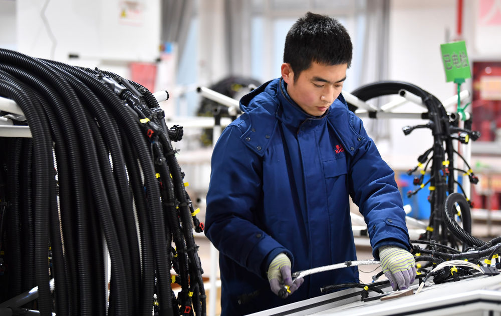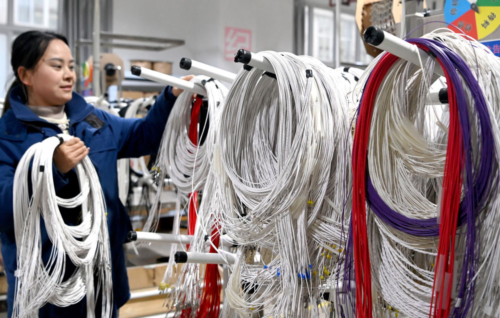 2月20日,在位于陕西省宝鸡市陇县苏陕工业园区的陕西恩达科技有限公司,工作人员在制作车用线束。新华社记者 刘潇 摄