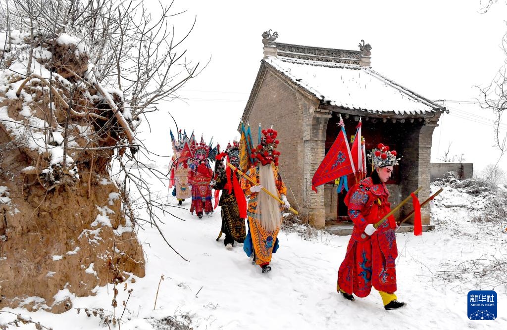 2月23日,陕西省宝鸡市陇县东南镇黄花峪村在进行社火游演。