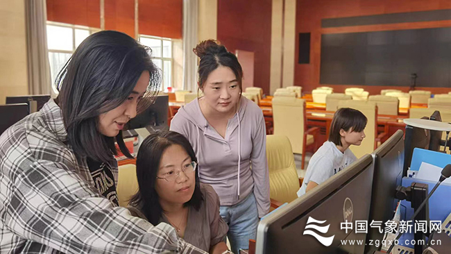 2023年9月18日,孟雪峰(左一)正在分析研判,制作预报服务产品。 图/云静波