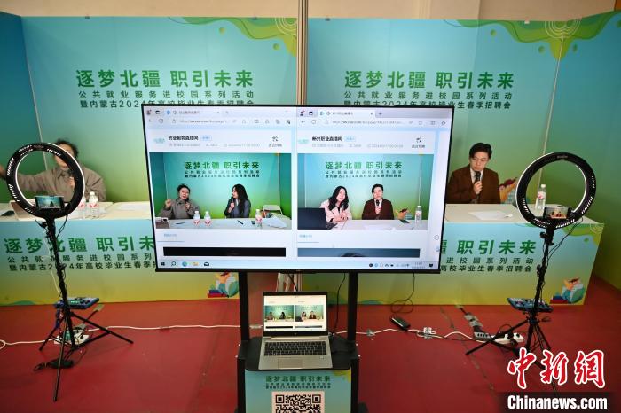 内蒙古呼和浩特市,招聘会现场设有线上直播区域。 中新网记者刘文华摄