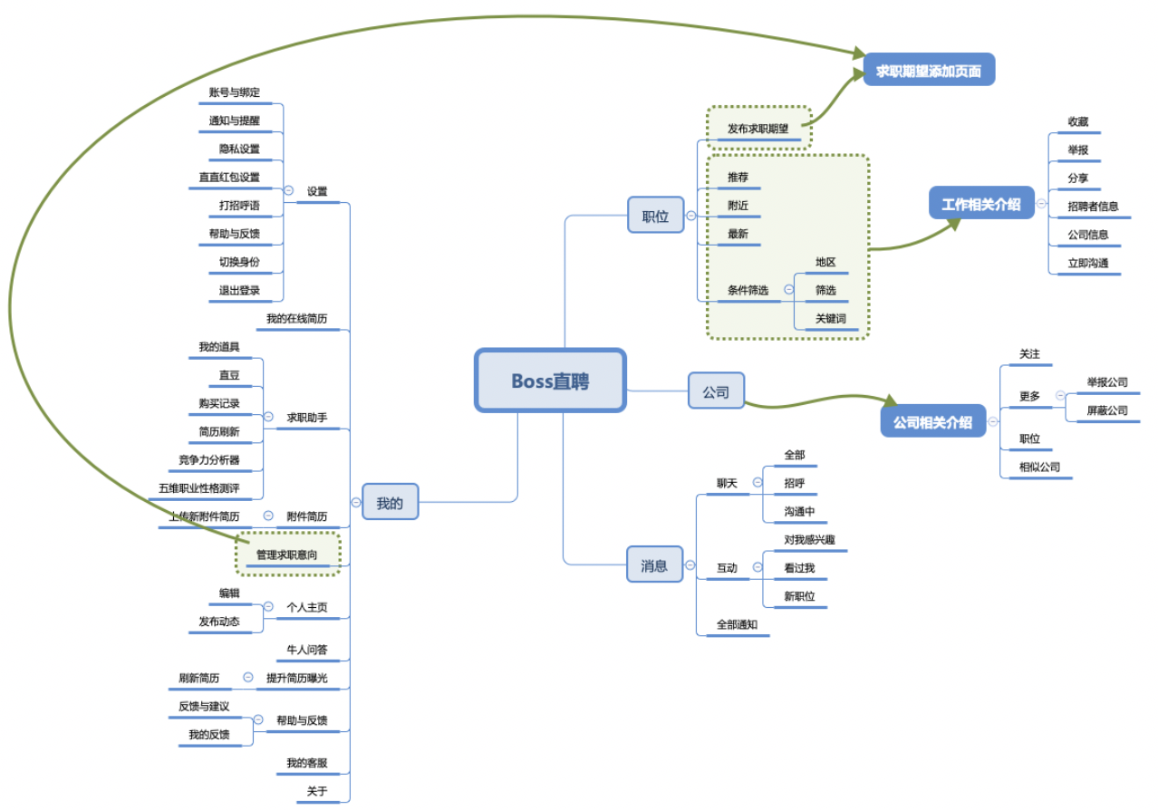 五、交互设计-流程图 5.1 核心功能流程概览笔者仅针对智联招聘、前程无忧和Boss直聘基本求职招聘功能(即从登陆到获得面试邀请)流程绘制流程图。