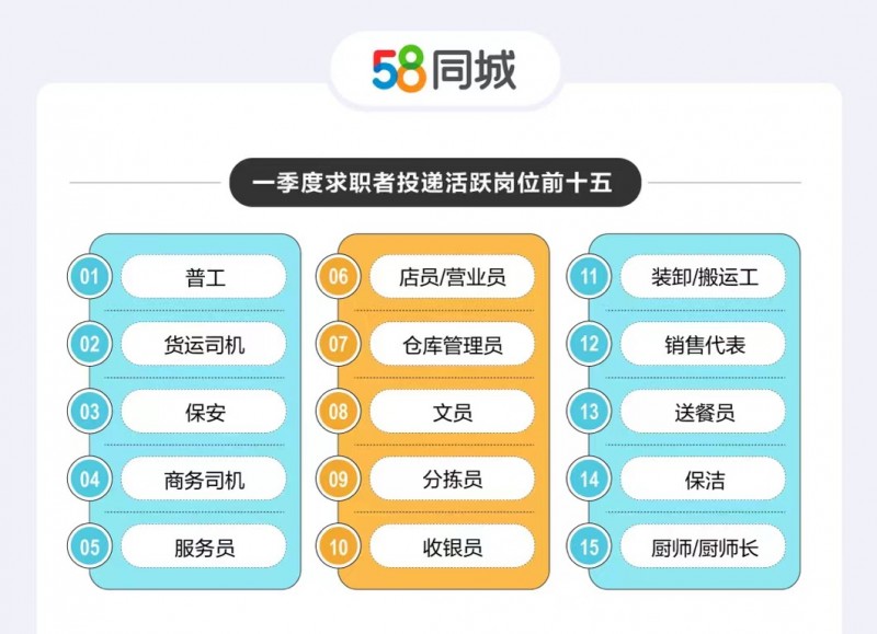 具体到热门岗位,58同城数据显示,今年一季度,简历投递量TOP15岗位分别为普工、货运司机、保安、商务司机、服务员、店员/营业员、仓库管理员、文员、分拣员、收银员、装卸/搬运工、销售代表、送餐员、保洁、厨师/厨师长,求职投递平均环比上涨20%。新年伊始,制造业企业抢订单、抓生产,相关领域释放出较多工作岗位,普工、货运司机等职位的简历投递量环比涨幅超过30%。