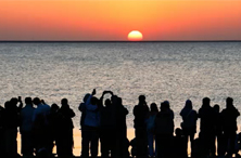 5月1日清晨,天津市滨海新区东疆亲海公园,游客在观赏海上日出。五一假期,人们走出家门,尽享多姿多彩的假日美好时光。五一假期,人们走出家门,尽享多姿多彩的假日美好时光。