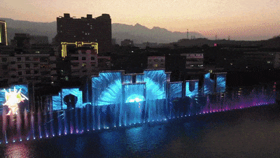 沉浸式互动建筑光影秀《欢欢喜喜过五一》照亮竹溪的夜空,实景山水与夜景灯光相互交融,打造水陆空立体视觉感官盛宴。