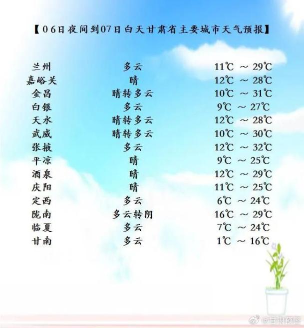 今天夜间到明天白天(05 月 06 日 20 时-05 月 07 日 20 时),甘南、陇南两州市多云转阴,局部地方有小雨或阵雨;省内其余地方晴或多云。另外,河西五市有 5-6 级偏东风,酒泉市西部有沙尘。