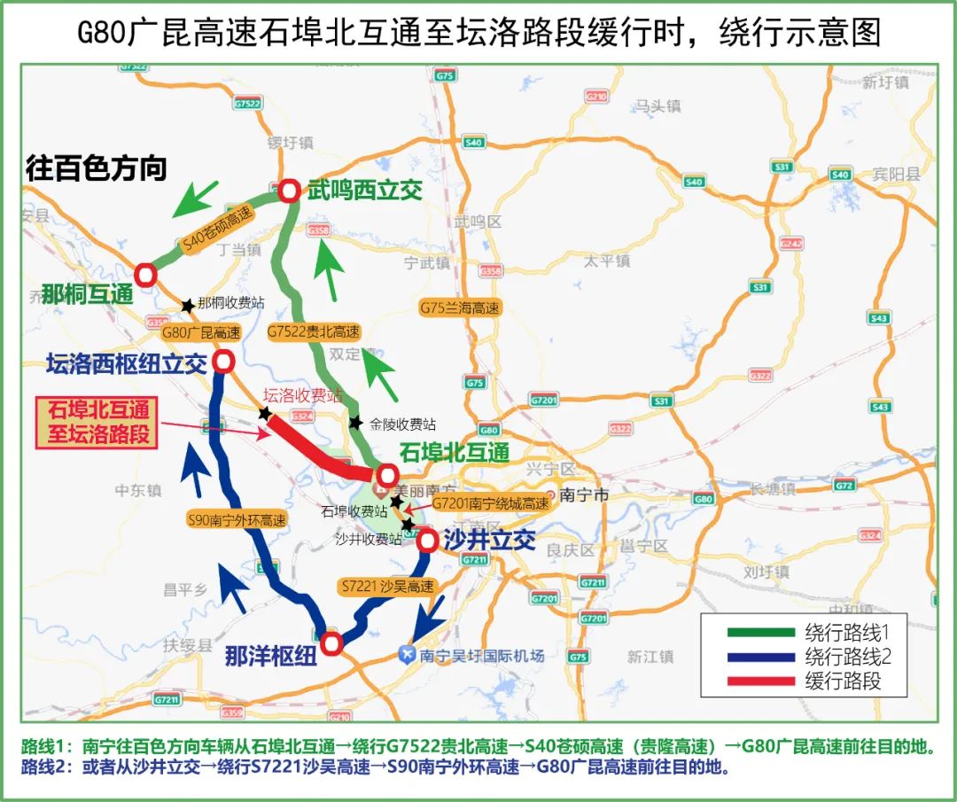 路线1:南宁往百色方向车辆从石埠北互通→绕行G7522贵北高速→S40苍硕高速(贵隆高速)→G80广昆高速前往目的地。
