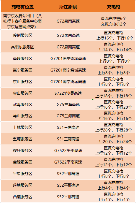 南宁高速公路运营有限公司管辖范围内共14对双侧服务区、1个单侧服务区、7对停车区,服务区已全部配置有充电桩,具体布情况如下: