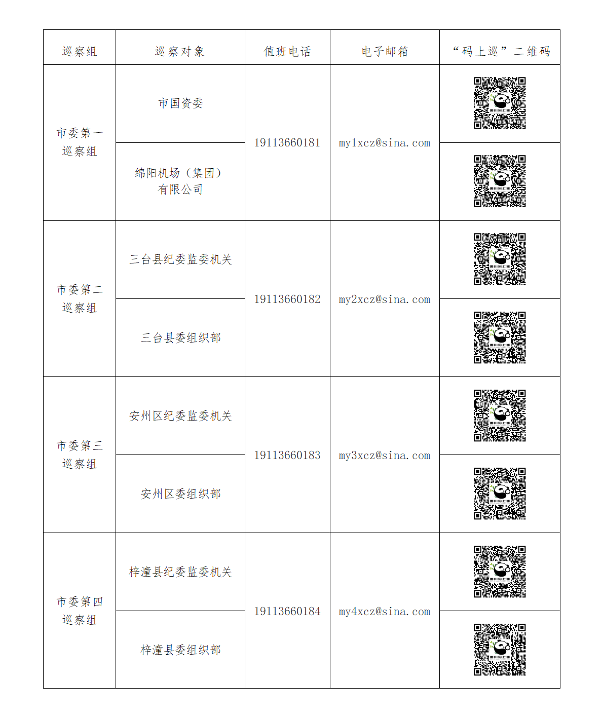 现将八届市委第六轮第二批巡察各巡察组分组名单、联系方式及“四川码上巡”二维码公告如下,欢迎广大干部群众如实反映有关情况和问题。