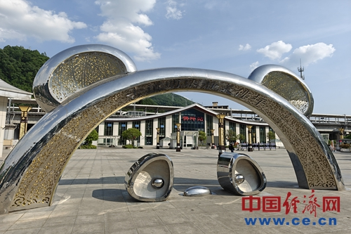佛坪站站前广场上的“熊猫眼”拱门。(中国经济网记者 佟明彪/摄)