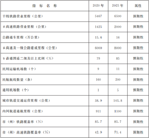 到2025年,东连西出、南耕北拓的综合运输通道初步形成,公铁空互为补充、高效衔接、便捷发达的综合交通运输网初步建成,综合交通枢纽布局进一步优化,交通运输覆盖广度、组织效率、多元化服务品质和联动融合发展能力大幅提升,旅客联程运输便捷顺畅,货物多式联运高效经济,交通运输对经济高质量发展的支撑能力稳步提升。