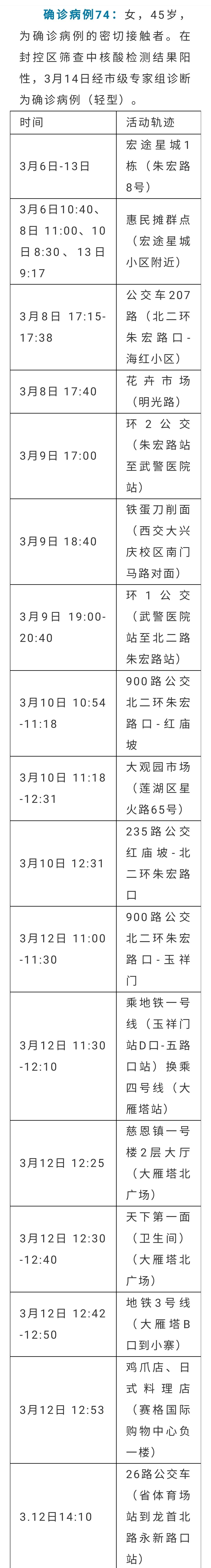 3月14日0时-24时,西安市新增6例本土确诊病例(2例轻型、4例普通型),4例集中隔离发现、1例封控区发现、1例社区筛查发现。现将主要活动轨迹公布如下(未公布的时间段尚未发现有公共场所活动轨迹):