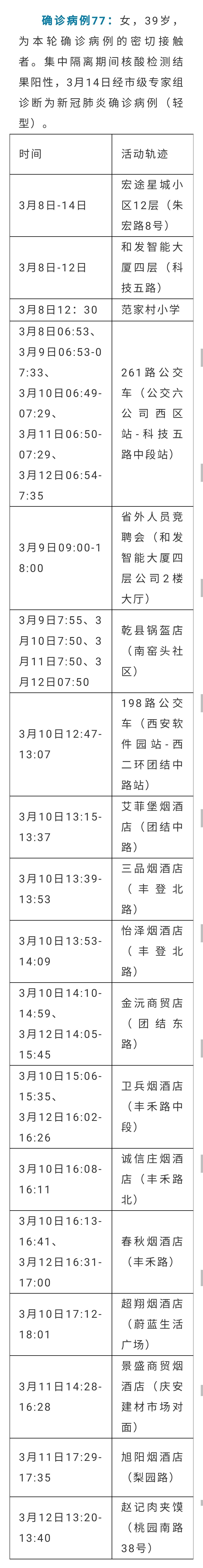 本轮确诊病例257,女,39岁,宝鸡市报告。与本轮确诊病例171在同单元楼居住,在管控区筛查中核酸检测结果阳性,3月15日经市级专家组诊断为新冠肺炎确诊病例(轻型)。