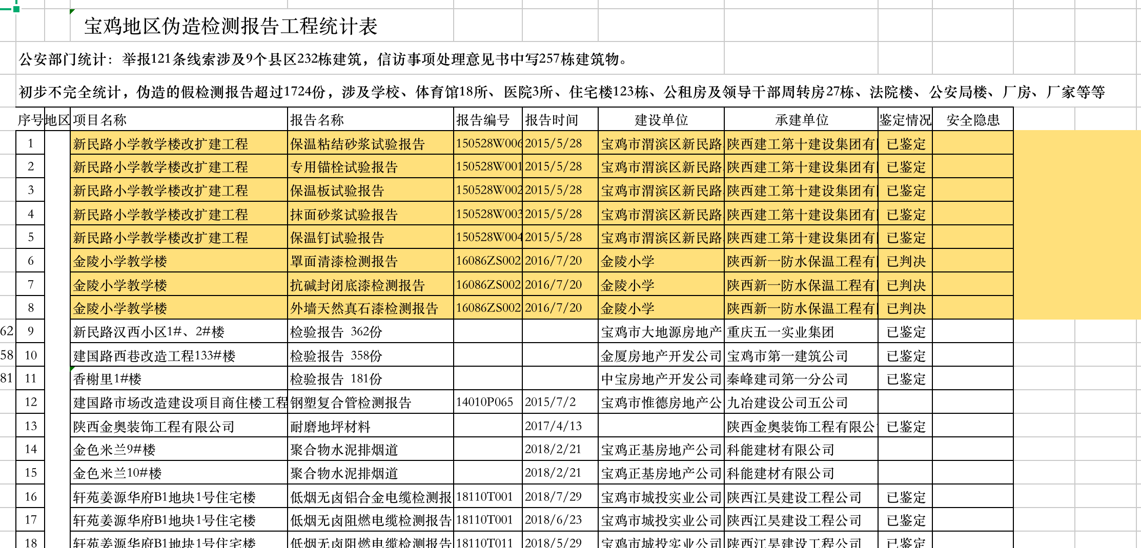 据张女士的不完全统计,包括经公安已鉴定或者司法已判决的在内,宝鸡市各县区已被发现的伪造张女士检测机构印章的有1718份假工程质量检测报告,涉及学校、体育馆18所,医院3所,居民住宅楼53栋,公租房及领导干部周转房27栋。少部分检测报告虽尚未得到公安的最终鉴定结论,但张女士所在机构从未对这些项目做过任何检测。