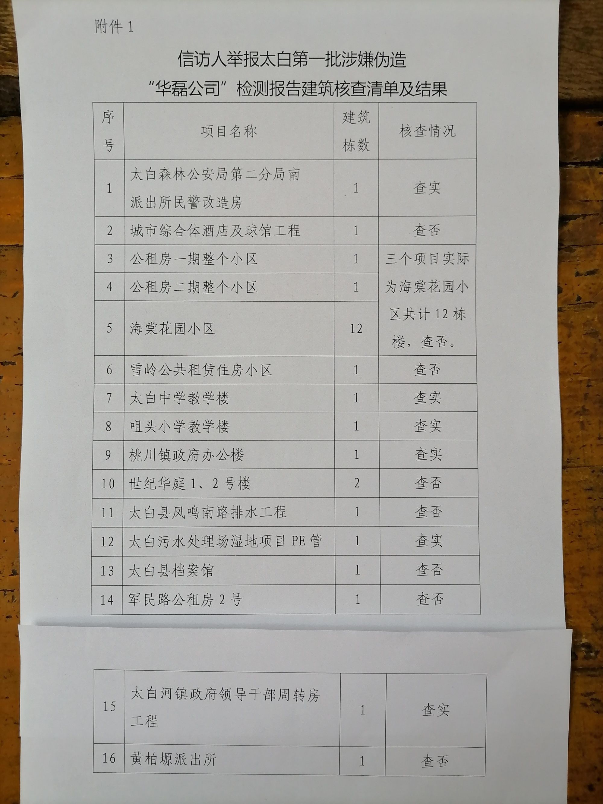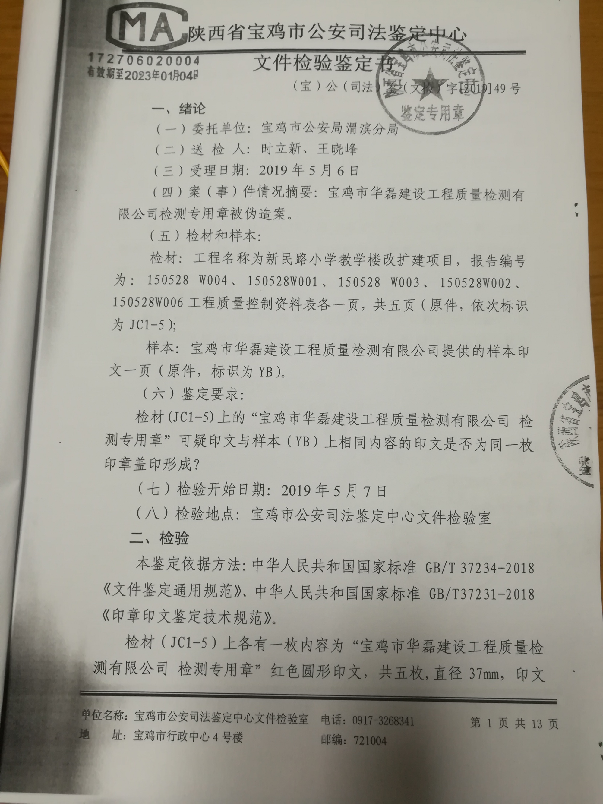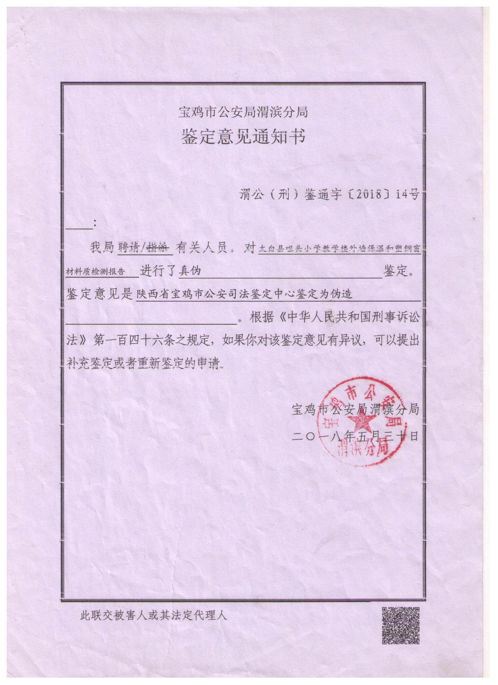 公安机关鉴定证实,太白中学教学楼相关检测报告系伪造
