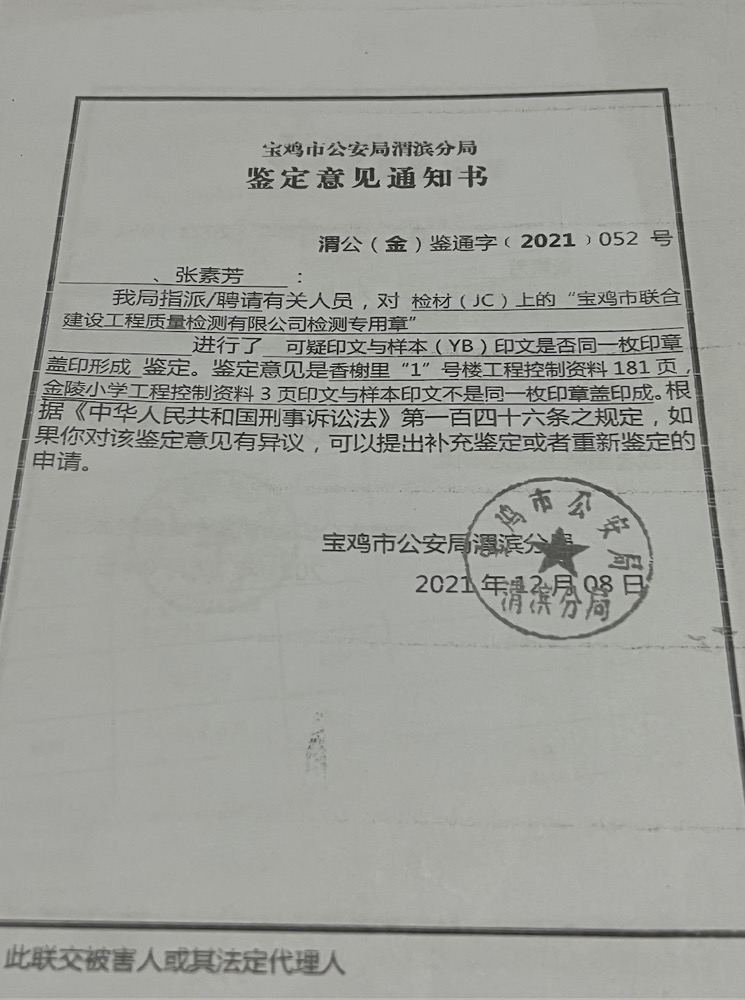 经历此事后,张女士开始特别留意伪造其机构印章的报告,竟发现工程质量检测市场上存在大量伪造其公司印章的虚假检测报告,他们决定向公安机关报案。张女士的同事、技术人员赵先生告诉记者:“这是太白县咀头小学教学楼工程,公安机关已作出鉴定意见通知书,外墙保温、塑钢窗等检测报告都是假的。这边是太白中学教学楼,公安部门出具的文书也已经查实。”