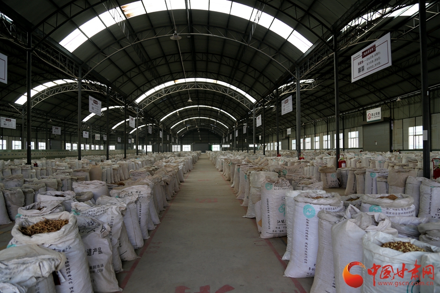 在康美甘肃西部中药城,一排排的仓库里整齐地堆放着各个商家的中药材。