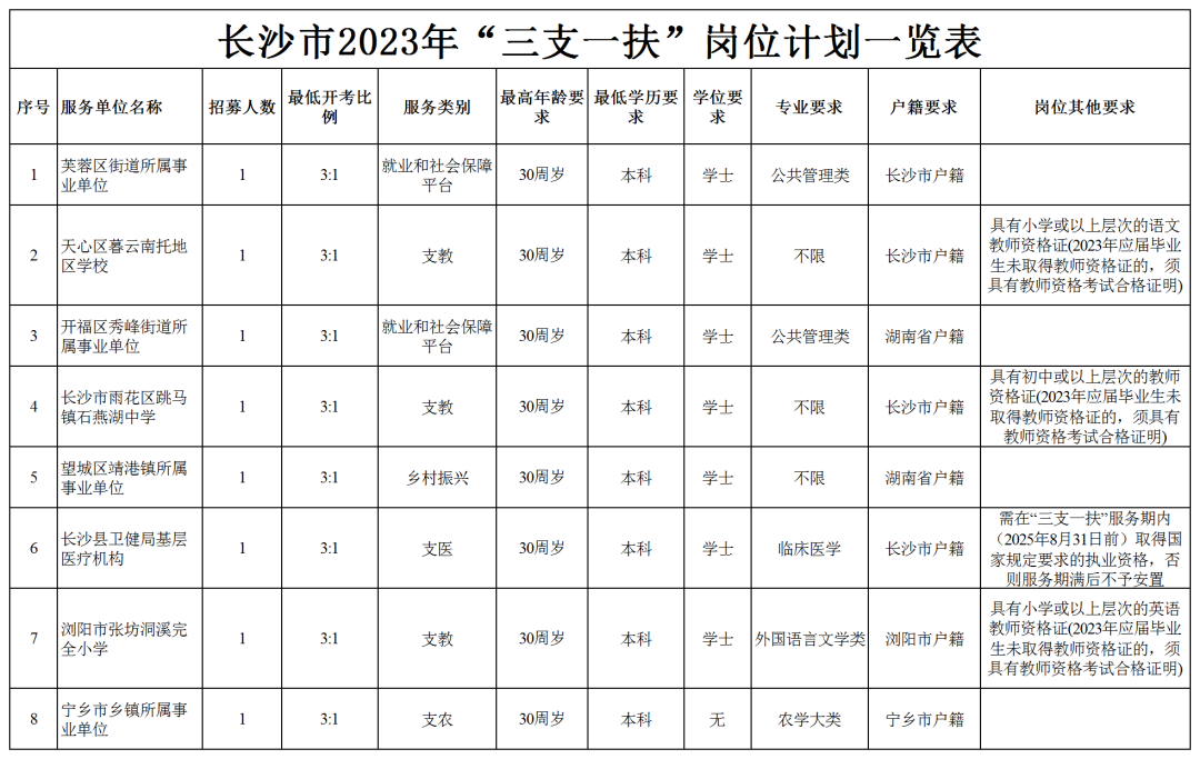 为深入贯彻习近平总书记关于引导高校毕业生到基层工作的重要指示精神,落实党中央国务院、省委省政府加快推进乡村振兴及做好高校毕业生就业创业工作的决策部署,根据省人社厅“三支一扶”计划招募工作安排,长沙市人社局发布长沙市2023年高校毕业生“三支一扶” 计划招募公告,公开招募一批高校毕业生到乡镇事业单位从事支教、支农、支医、帮扶乡村振兴等工作。