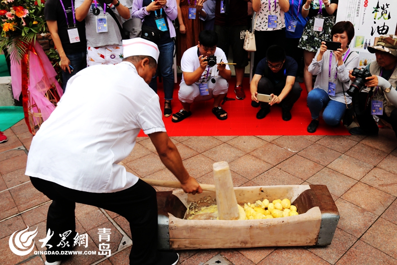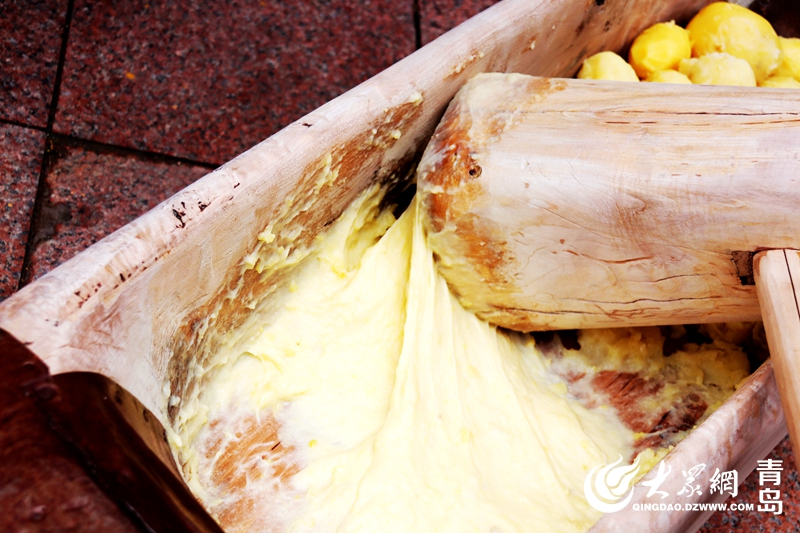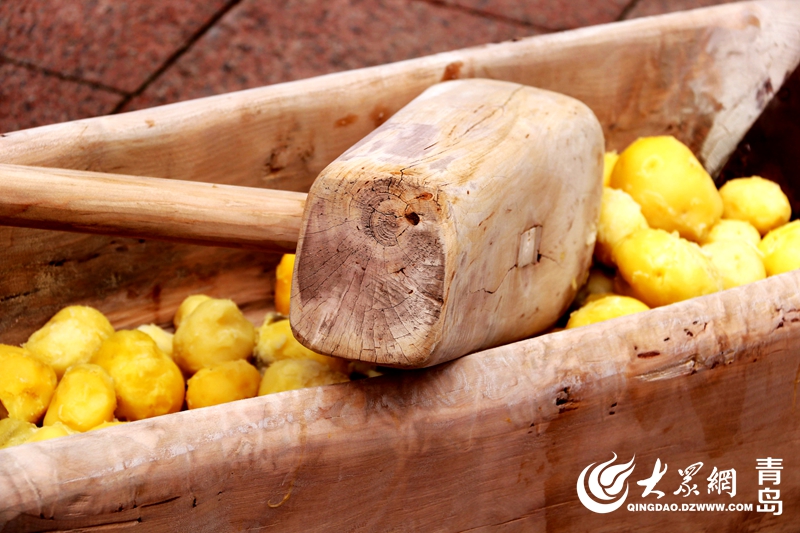 在金沙滩啤酒城博览小镇的“东西协作,山海情深”陇南武都特色美食展馆门前,来自武都的大厨郭新社正在木槽里捶打煮熟的土豆(洋芋),圆滚滚的土豆随着一阵“砰砰砰”声的捶打,渐渐变成了淡黄色的土豆泥,吸引了众多游客驻足。