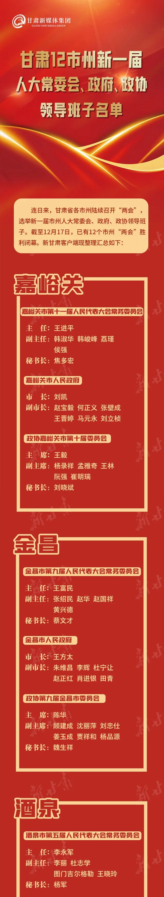 连日来,甘肃省各市州陆续召开“两会”,选举新一届市州人大常委会、政府、政协领导班子。截至12月17日,已有12个市州“两会”胜利闭幕。新甘肃客户端现整理汇总如下:
