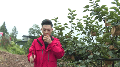 这颗是我从树上刚刚剪下来的太秋甜柿。这个特色水果的味道怎么样呢?我替大家先尝一尝。嗯,非常的甜,而且非常多汁。这个柿子跟以往我们吃过的柿子最大的区别就是它可以从树上摘下来直接吃,不用拿到房间里面去回软,味道非常的香甜。