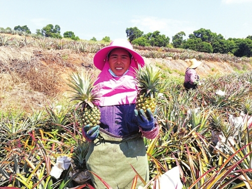 11月24日下午,郁郁葱葱的菠萝园里,一颗颗黄澄澄的菠萝从绿叶中露出头来,空气里弥漫着浓郁的菠萝果香。工人们正忙着采摘金菠萝:左手握住金菠萝“头部”,右手拿着镰刀从底部利落一挥,一颗金菠萝就成功采摘。47岁的付楚荣开着农用三轮车,把一车车采好的菠萝拉回公司。