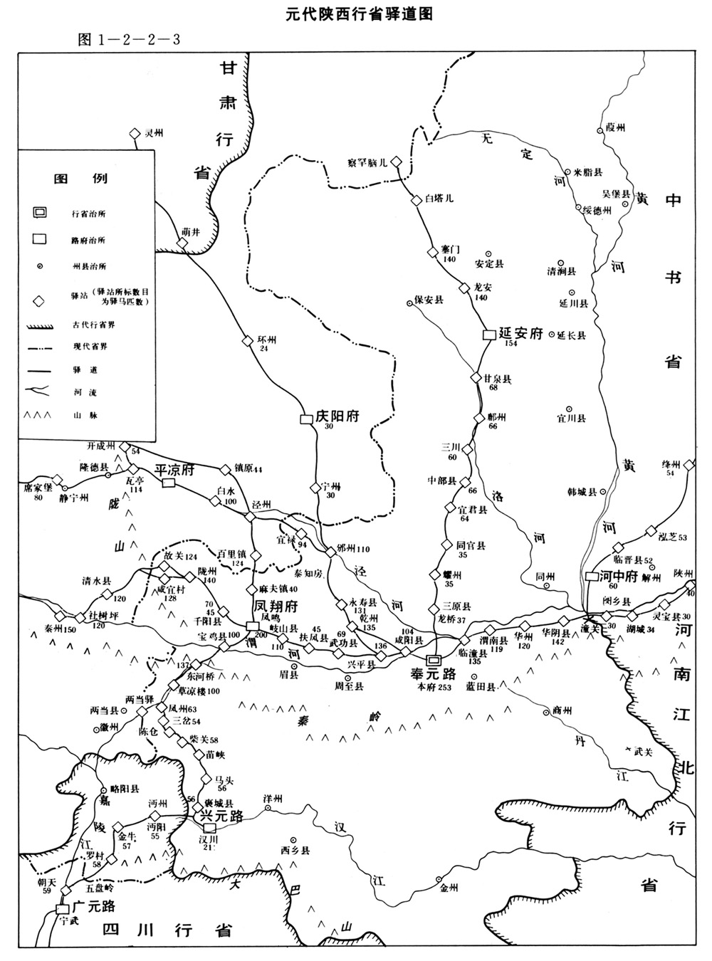 1.大都至奉元。由大都经河北逾河南洛阳、新安、渑池、硖石、陕州、灵宝、湖城、阌乡、华阴、华州、渭南、临潼至奉元。