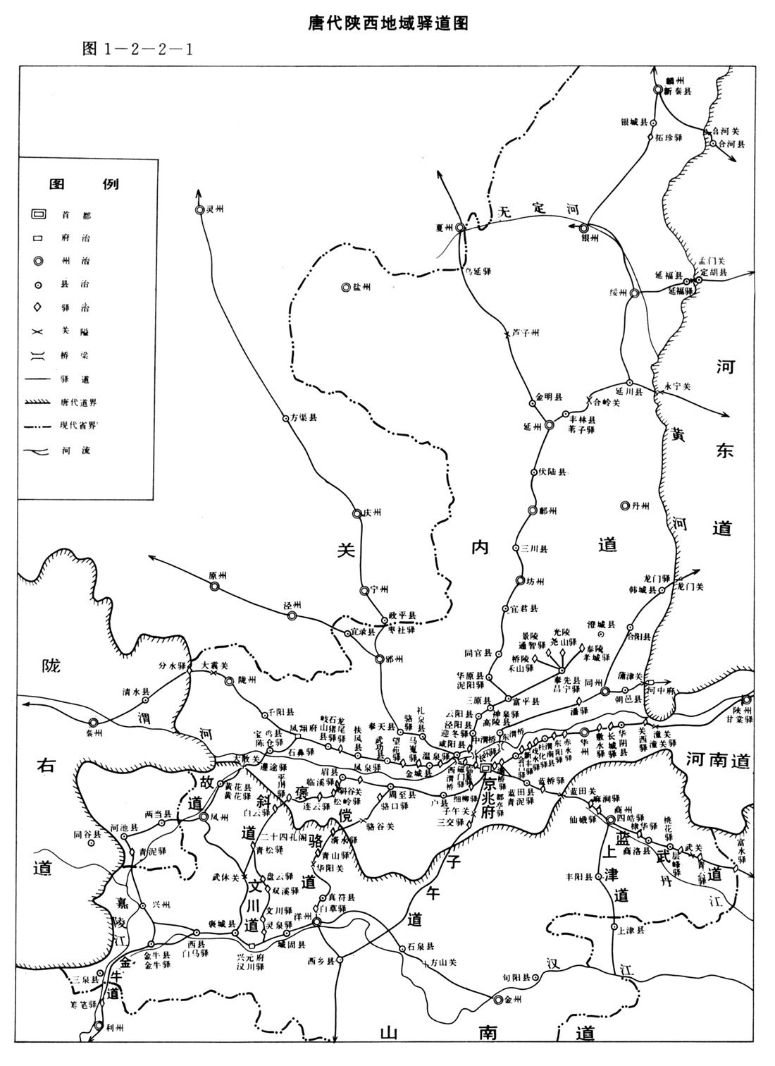 11.从长安向东北,经同州出蒲关至北京太原的驿道。从太原向东出娘子关可与从洛阳东北去幽州的驿道相连,向北出雁门关则可与从长安通往东受降城的驿道相连。唐代以长安为中心四通八达的驿路网详情见图1—2—2—1。
