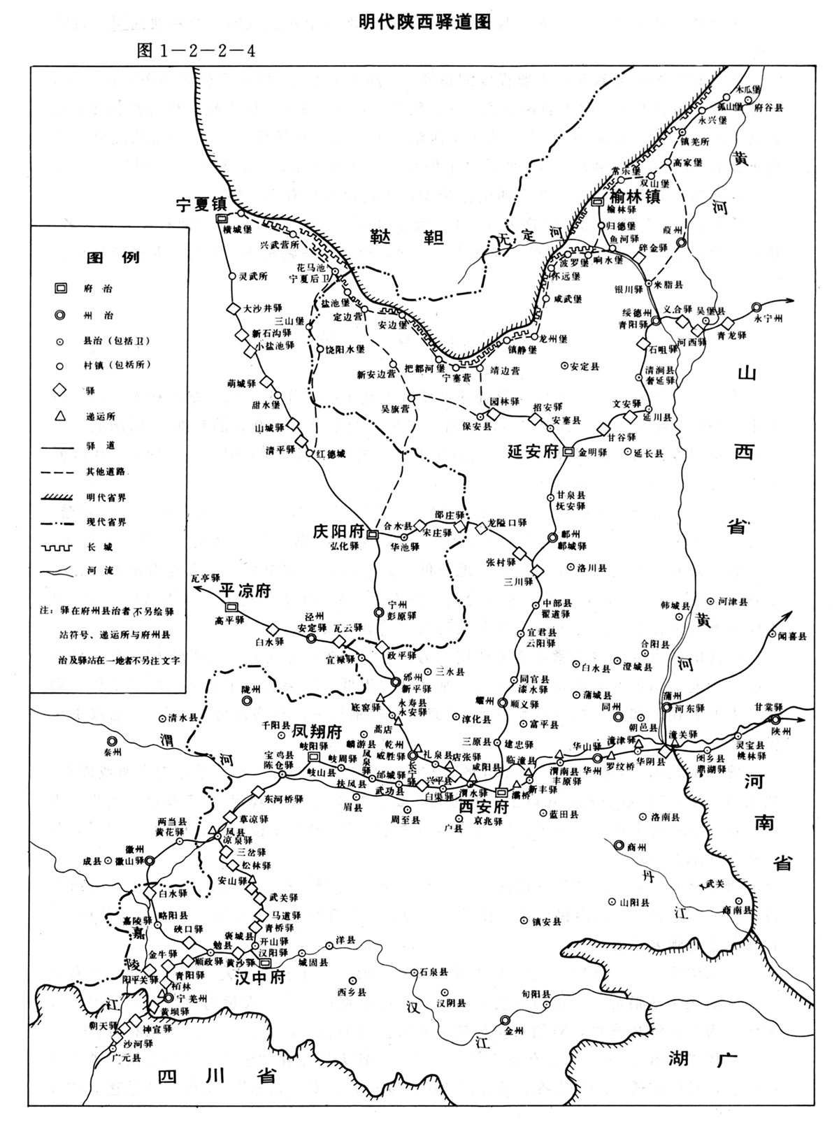 6.陕西长城边路(自东而西):黄甫川堡~清水营~木瓜圆堡~孤山堡~神木堡~永兴堡~镇羌所~大柏油堡~柏林堡~高家堡~建安堡~双山堡~长乐堡~延绥镇榆林卫~归德堡~鱼河堡~响水堡~波罗堡~怀远堡~威武堡~清平堡~龙州城~镇静堡~靖边营~宁塞营~把都河堡~旧安边营~砖井堡~定边营~盐场堡~花马池至宁夏后卫通宁夏卫(今银川市)。从宁塞营另一路通新安边营~新兴堡~石涝池堡~三山堡~饶阳水堡。明代驿路详情见图1—2—2—4。