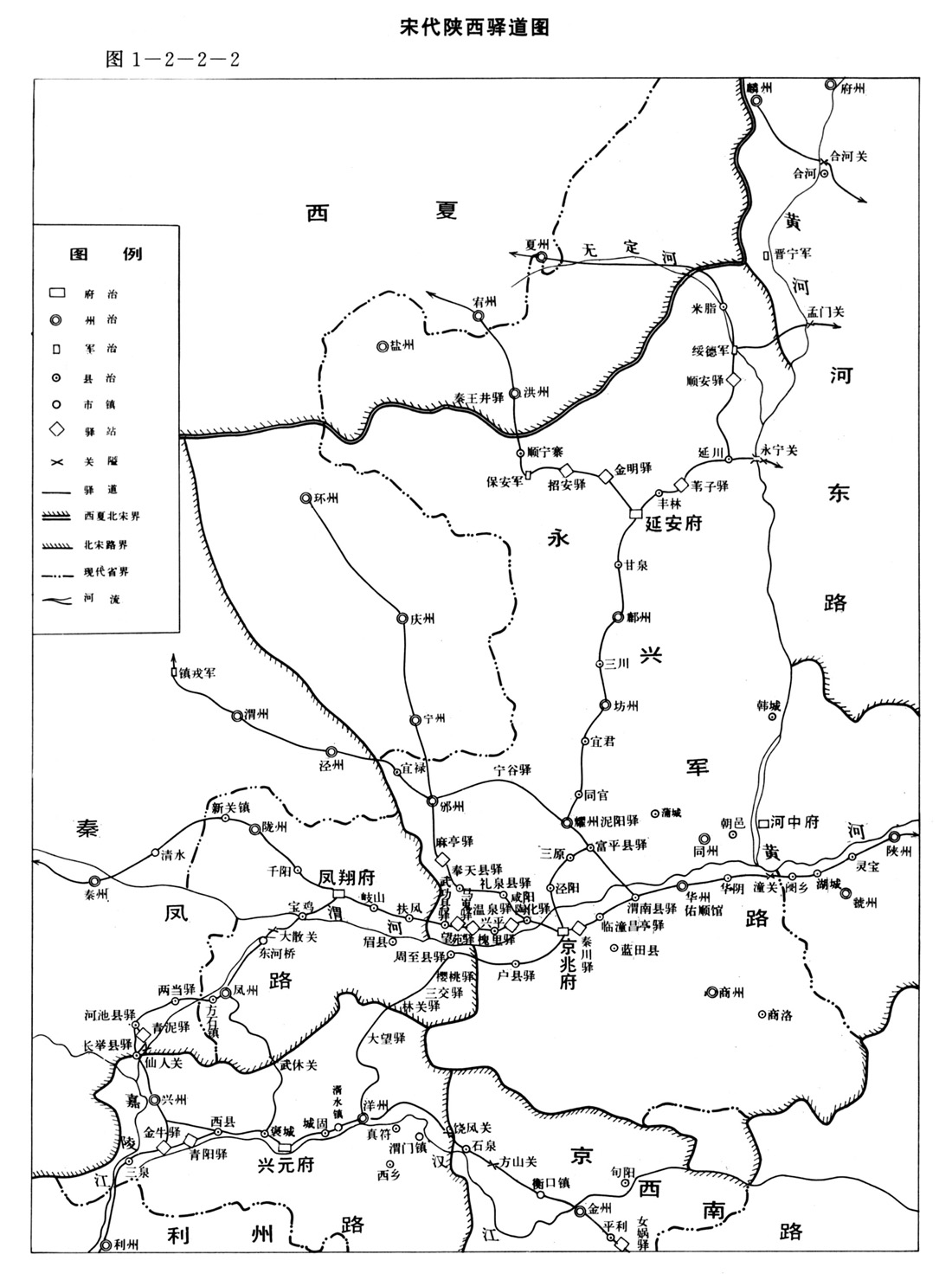 北宋前期,陕西关中和陕北大部分都属于陕西路。神宗熙宁五年(1072)分陕西路为永兴军路和秦凤路两路。永兴军路治京兆府(今西安市),秦凤路治凤翔府,后移秦州。汉中地区当时属利州路,利州路的治所在兴元府(今汉中市)。安康地区当时称金州,属京西南路管辖,京西南路的治所在襄阳。榆林地区的府谷、神木、佳县等地则归治所在太原的河东路管辖,榆林及其以西的横山、靖边、定边等地则为建都于兴庆府(宁夏银川市)的西夏政权所有。由于全国首都已由长安东移至开封,而西北方又有西夏对峙,所以陕西和长安在全国驿道网中的地位以及陕西境内的驿道布局都发生了重大的变化。长安由全国驿道网络的中心变成首都西方控扼通向广大西北和西南地区驿道的枢纽。从长安东经华州出潼关通洛阳和首都开封,西经凤翔府、陇州出大震关通秦州以及吐蕃和西域等地的驿道,仍保持着原来的重要地位。从长安向西北经乾州至邠州,再由邠州分向凉州和西域及灵武和漠北的驿道,已均因西夏的建立而被截断。从长安向北经耀州、坊州(今黄陵)、鄜州、延州以通河套三受降城的驿道,延州以北各段也因西夏的隔阻而不通。而从延州向西北,经保安军到西夏的宥州(今陕西靖边、定边与内蒙鄂托克旗接界处的城川附近),又开辟了一条“国信驿路”,作为和平时期两国使臣来往的指定道路,两国互货贸易的榷场也就设在保安军。由于军事和政治的需要,从陕北的延州向东渡黄河到河东路的晋州(今山西临汾),从绥德军东渡黄河到河东路的石州(今山西离石),从麟州和府州东渡黄河到岚州(今山西岚县)都辟有驿道,通向河东路太原府以至首都汴梁,以加强边境与内地的联系。关中地区,从渭南经耀州折向邠州,围绕京兆府东、北、西北三面,也开辟了一条新的驿道,当也与巩固关中,加强对西夏的军事防备有关。至于从长安向东北经同州出蒲津关的驿道和从长安向东南经商州出武关的驿道,从长安向正南通往金州的驿道,均已因政治军事情况的变化而废弃。从长安向西南经兴元府通向四川的秦岭诸谷道,也只有故道经常置驿以连接金牛道。北宋初年乐史编写的《太平寰宇记》称,兴元府至西京(洛阳)取骆谷路1580里,取斜谷路1789里,驿路2078里;至长安取骆谷路652里,取斜谷路933里,驿路1223里。“驿路”即指故道线,仍沿唐代之旧。斜谷路指唐宋褒斜道,即宝鸡、凤州、褒城、汉中线。实际此线北宋时作为大驿路的时间只有几年,而傥骆道上设有驿馆,也只是北宋熙宁年间宋敏求编写的《长安志》中有记载,但所说的周至县南通洋州道上的终南山樱桃驿、三交驿、林关驿和洋州真符县大望驿究在何处难得确定,是否仍沿原来的傥骆道路线及其使用时间长短亦不得而知。于是,北宋时期以长安为中心向四方辐射的驿道比唐代减少了大半,并在秦岭以北地区形成了有几条基本东西行的驿道互相并列的新格局。
