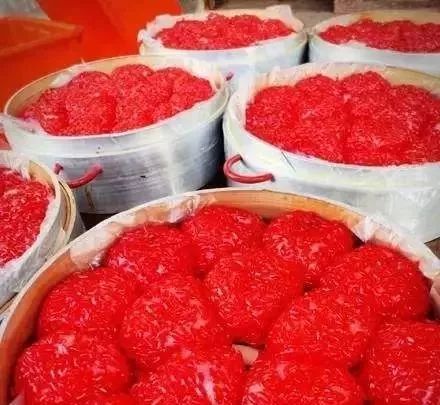 红色寓意吉祥代表喜气,与办喜事什么物件都要沾红带红一样,义乌人有一种过年过节或者办喜事用得很多的“红色”食物,那就是义乌红馃。