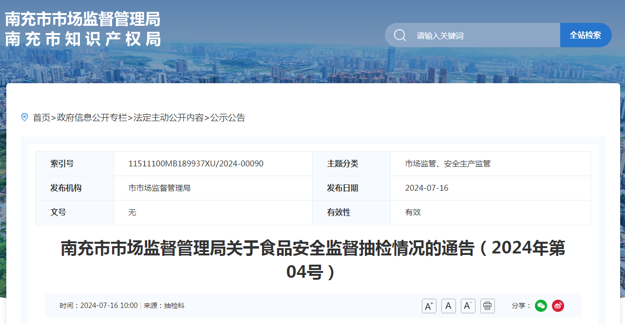 南充市市场监督管理局关于食品安全监督抽检情况的通告(2024年第04号)