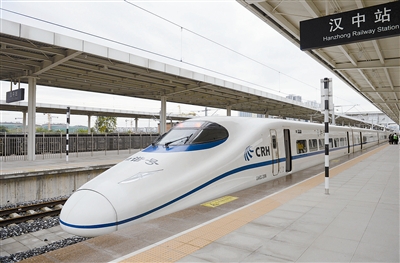 西成高铁试运行列车停靠在汉中站(10月13日摄)。