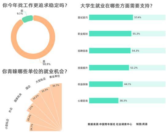 调查显示,90.9%的受访应届毕业生今年找工作更追求稳定。