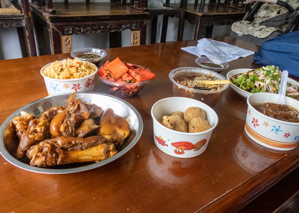 我点的是一斤青岩卤猪脚、糕粑稀饭、酸萝卜、玫瑰冰粉、青岩豆腐圆子、蔬菜凉粉外加一份蛋炒饭。基本上把青岩古镇的特色小吃都点了。