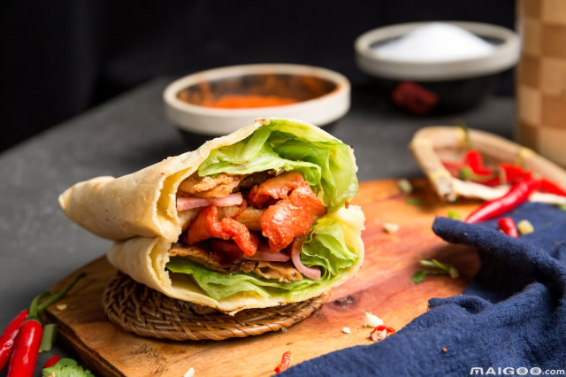 肉夹馍是中国北方最火的小吃之一,是陕西美食的代表,如今已遍布全国。陕西地区有使用白吉馍的腊汁肉夹馍、宝鸡西府的肉臊子夹馍、潼关的潼关肉夹馍等,其中腊汁肉夹馍选用猪硬肋条肉,加以多种中草药,投入滋味浓郁的老汤,文火慢炖而成,风味特别,久贮不腐,瘦不留渣,肥不腻口;白吉馍皮酥里嫩,中心空虚,便于夹肉,吃口香甜。M_aigoo美食小编了解到,我国其他地区类似的吃法还有河北的驴肉火烧。一个肉夹馍配上凉皮、冰峰汽水,是陕西各大美食街和路边餐馆小摊的常见搭配,十几元就能吃饱喝足,是中国北方常见的平民食物之一...。 【 详细>>】