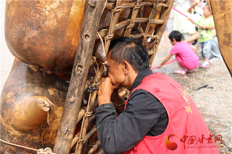 他们手中的桨承载着来来往往游客们的安全,严肃而认真的神情肩负着游客们的期望,安全便是最重要的使命。到下游后,筏子客再用快艇将羊皮筏子拉回,到岸后将筏子卸下拉上岸,检查是否有松动、漏气的情况。更让人诧异的是,检查过程中若发现瘪了气的羊皮袋,筏子客们便用嘴使劲往皮囊里吹气。