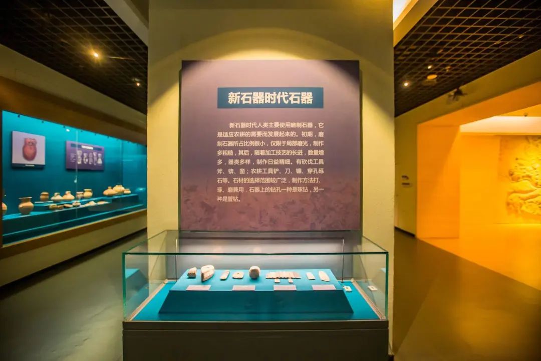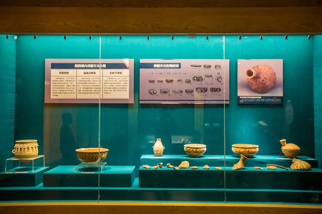 仰韶文化是黄河流域新石器时代早期文化遗址的代表,在陇西地区曾发现了二十余处遗址,在这些遗址中出土的许多文物都展陈在馆中。孔雀蓝做背景,搭配上泛黄的灯光,让这些陶器染上了时光的味道。