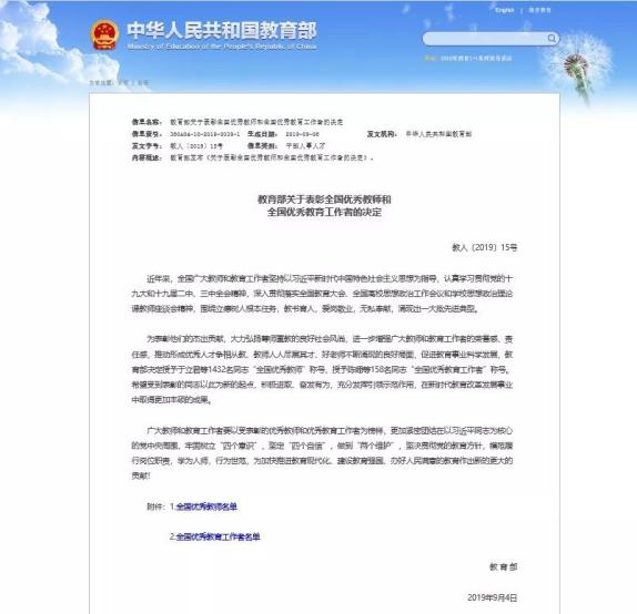 9月9日,教育部官网发布了《教育部关于表彰全国优秀教师和全国优秀教育工作者的决定》和《人力资源社会保障部 教育部关于表彰全国教育系统先进集体和全国模范教师全国教育系统先进工作者的决定》。授予597个单位“全国教育系统先进集体”称号、718名同志“全国模范教师”称号、79名同志“全国教育系统先进工作者”称号、1432名同志“全国优秀教师”称号、158名同志“全国优秀教育工作者”称号。被授予“全国模范教师”和“全国教育系统先进工作者”称号的人员,享受省部级表彰奖励获得者待遇。