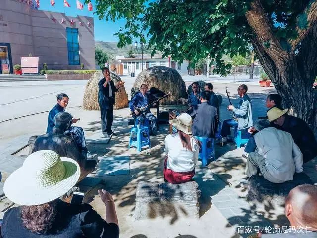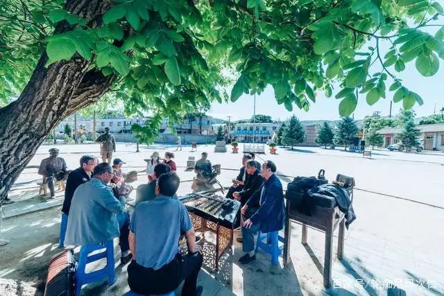 榜罗镇在波浪梯田中并不起眼,它的外观和通渭其他黄土丘陵小村区别不大。半山上,土坯片山瓦房群围绕着一个古堡。走进镇子,看到绿树成荫,悠闲的乡人蹲在核桃树荫下,心无旁骛欣赏着一出地方戏。戏班子的主唱吼的方式类似秦腔,表情凝重,气势酣畅淋漓,唱出了岁月流逝。间歇休息的时间,喝两口小酒,以此平复波涛汹涌的激情……