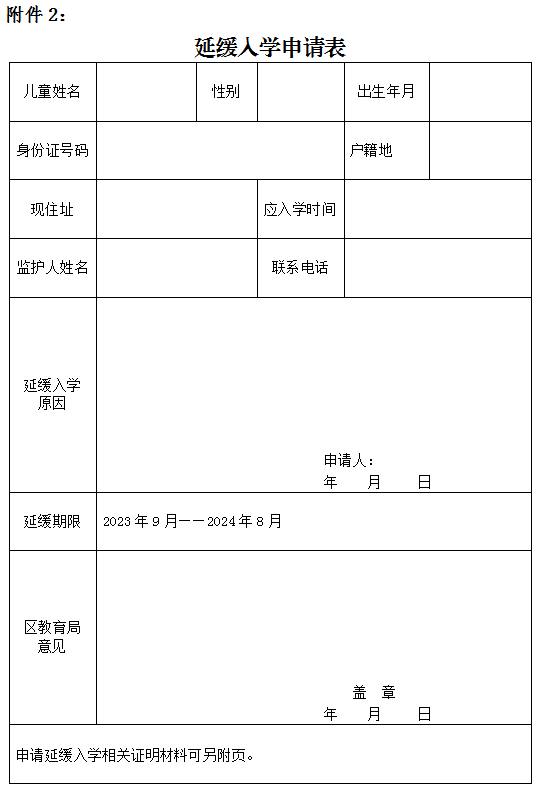 4.已年满6周岁(即在2017年8月31日前出生的)的适龄儿童,应办理入学手续;确需延缓入学的,可填写《延缓入学申请表》到户籍所在乡镇(街道)、区教育局办理延缓入学手续。