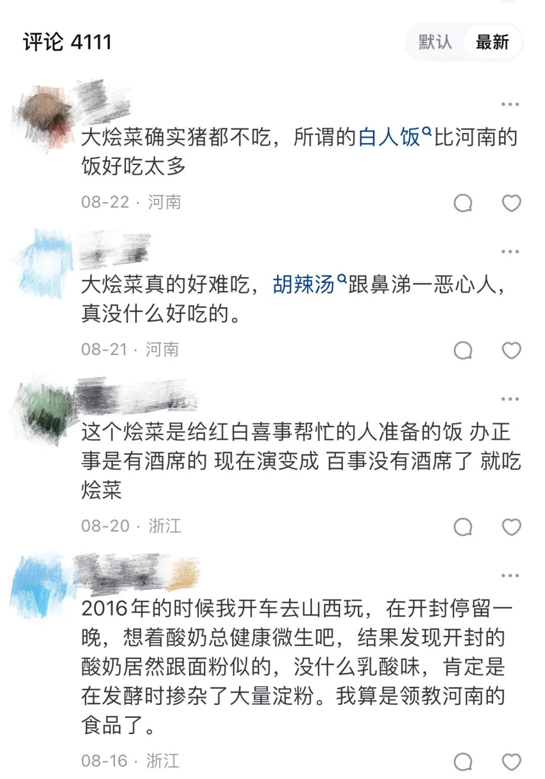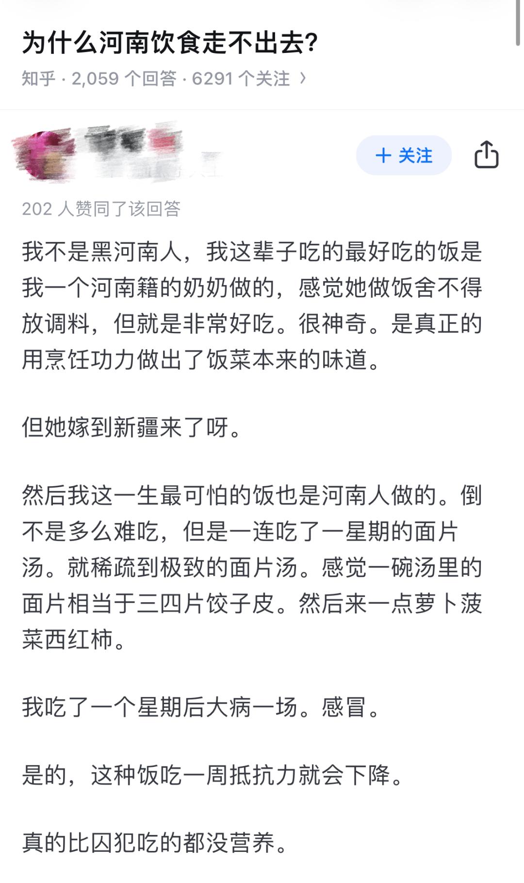 某乎上曾有个神贴,盖了1000多层楼,全是外地人吐槽河南菜难吃的。什么“胡辣汤就是老北京炒肝儿和酸辣汤的合体,黏黏糊糊,难吃集合”,“烩菜都是不讲什么道理的汤水混煮,吃起来既不爽又不刺激”;“河南穷,大米和肉不够才会这么吃”… 一溜烟读下来,嫌弃值指数级叠加,站出来为河南菜说话的,几乎没有。