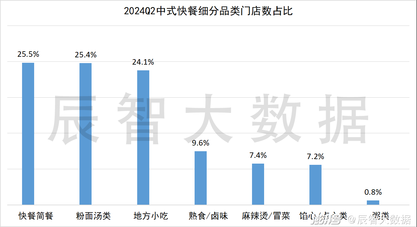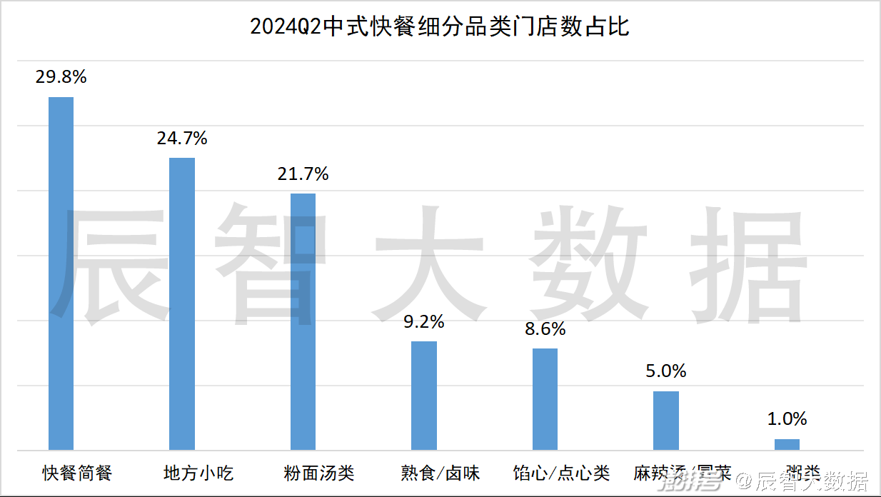以中国餐饮第一大品类中式快餐为例,辰智大数据显示,截至2024Q2,全国中式快餐TOP3细分品类分别是快餐简餐(29.8%)、地方小吃(24.7%)和粉面汤类(21.7%)。